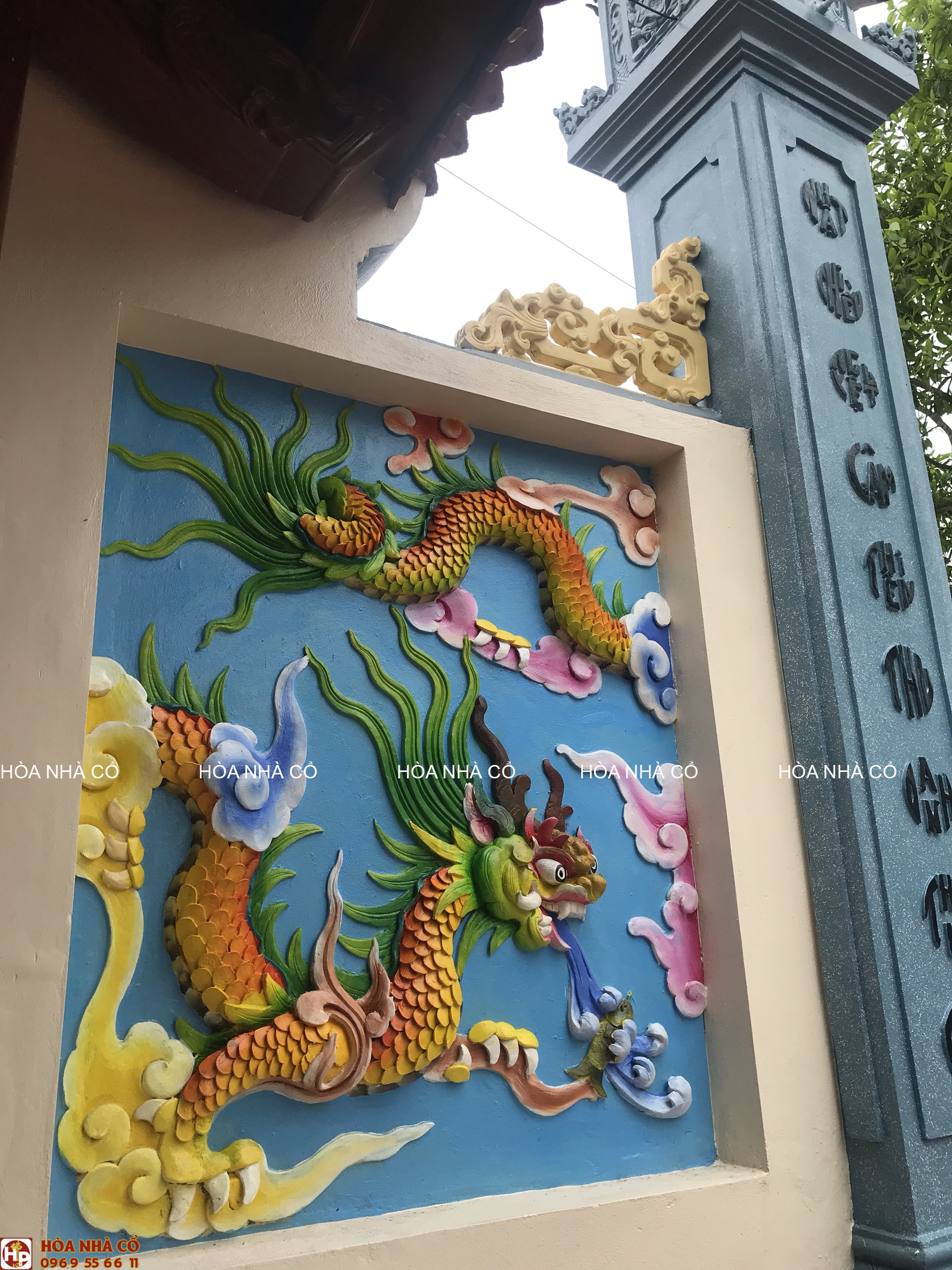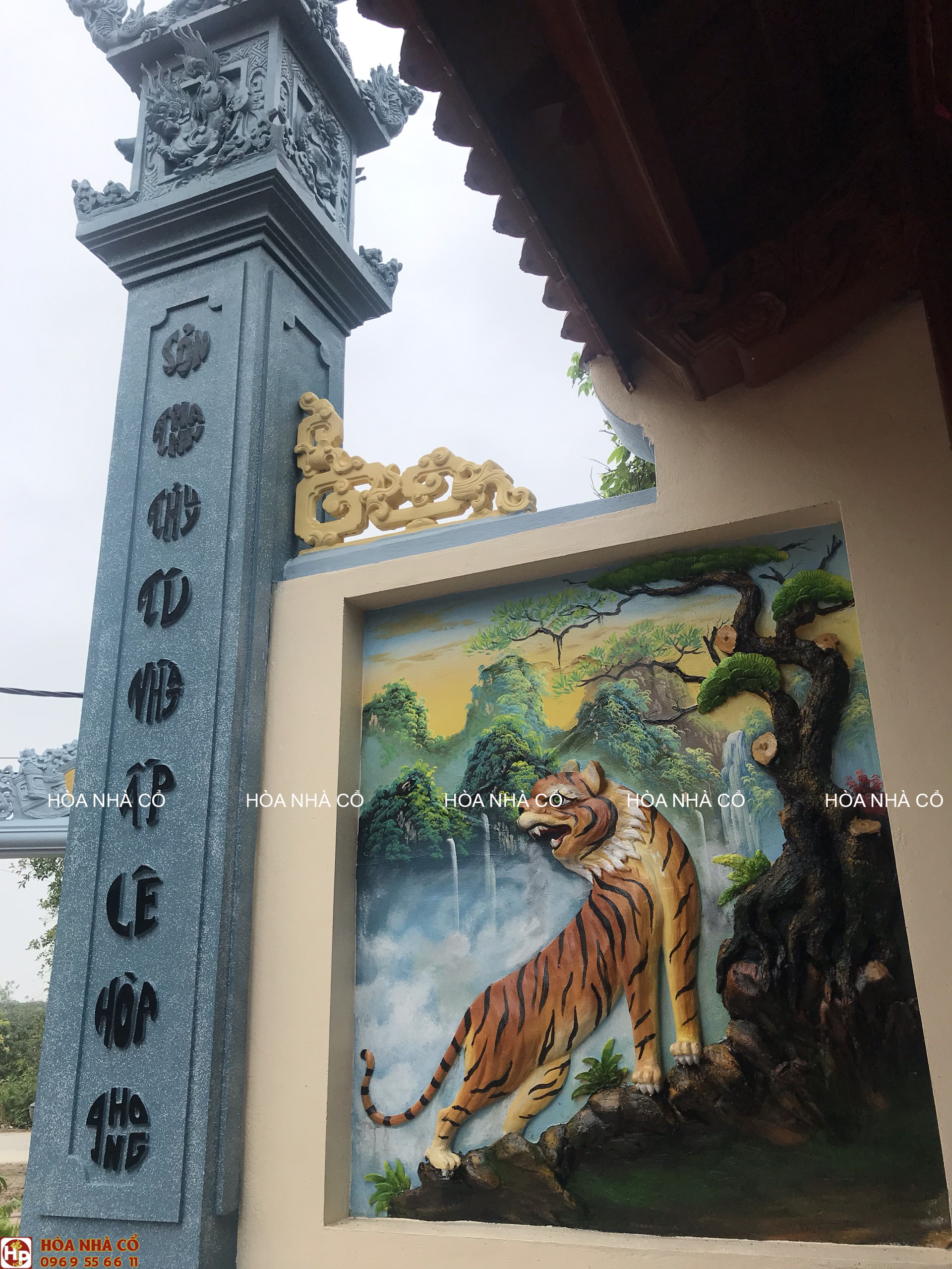 - Phía trước có 2 cột đồng trụ, bậc tâm cấp có chiếu rồng phượng ở giữa và cuốn thư đá