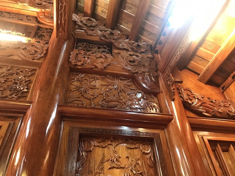 - Những đường nét chạm trổ trên hoành, dui, nóc, xà, cột,... được những nghệ nhân ở đây làm tỉ mỉ, chi tiết mang tới không gian sống thật sự mộc mạc gần gũi và bình yên truyền thống đối với gia chủ và các thành viên của gia đình.