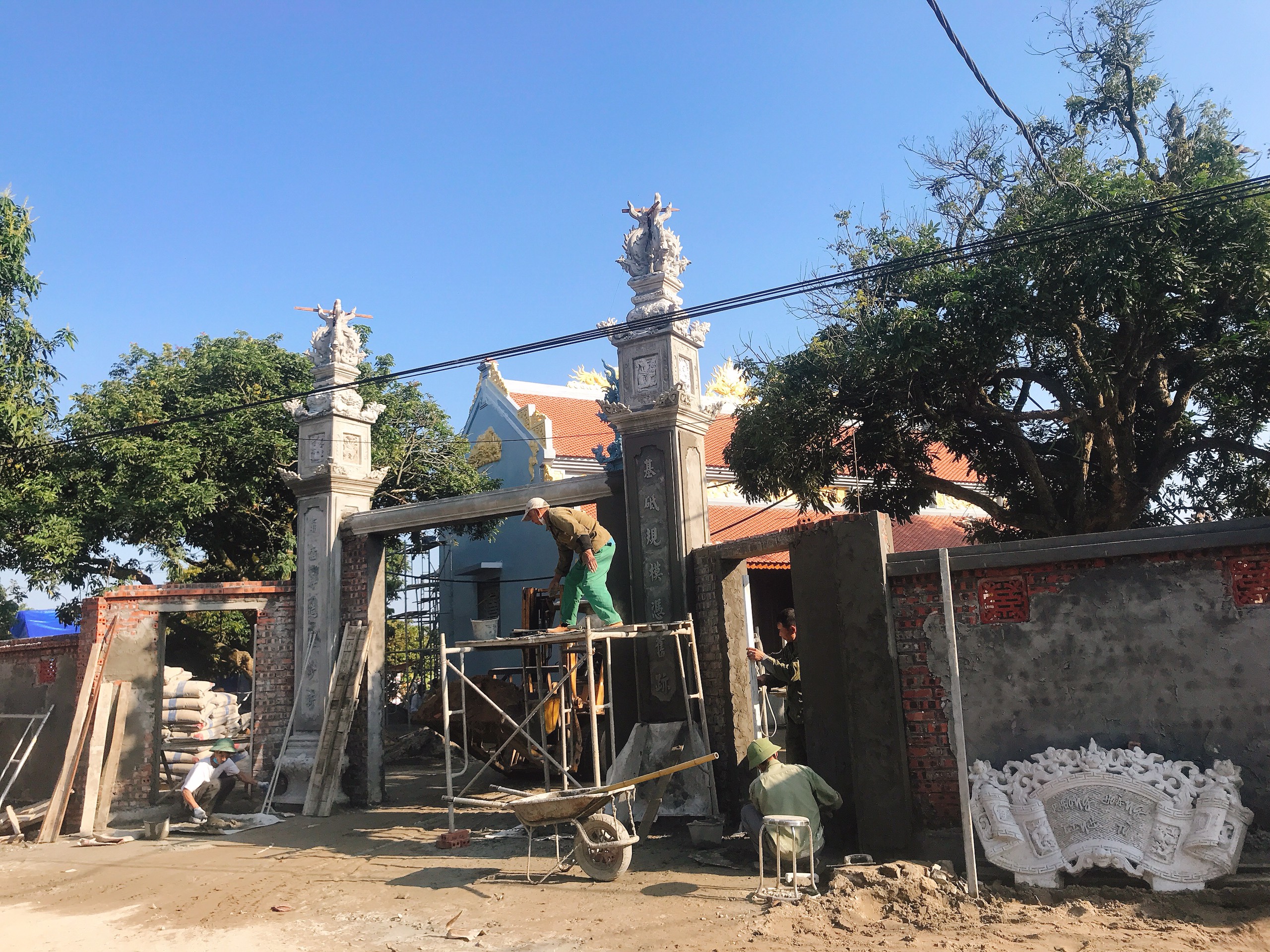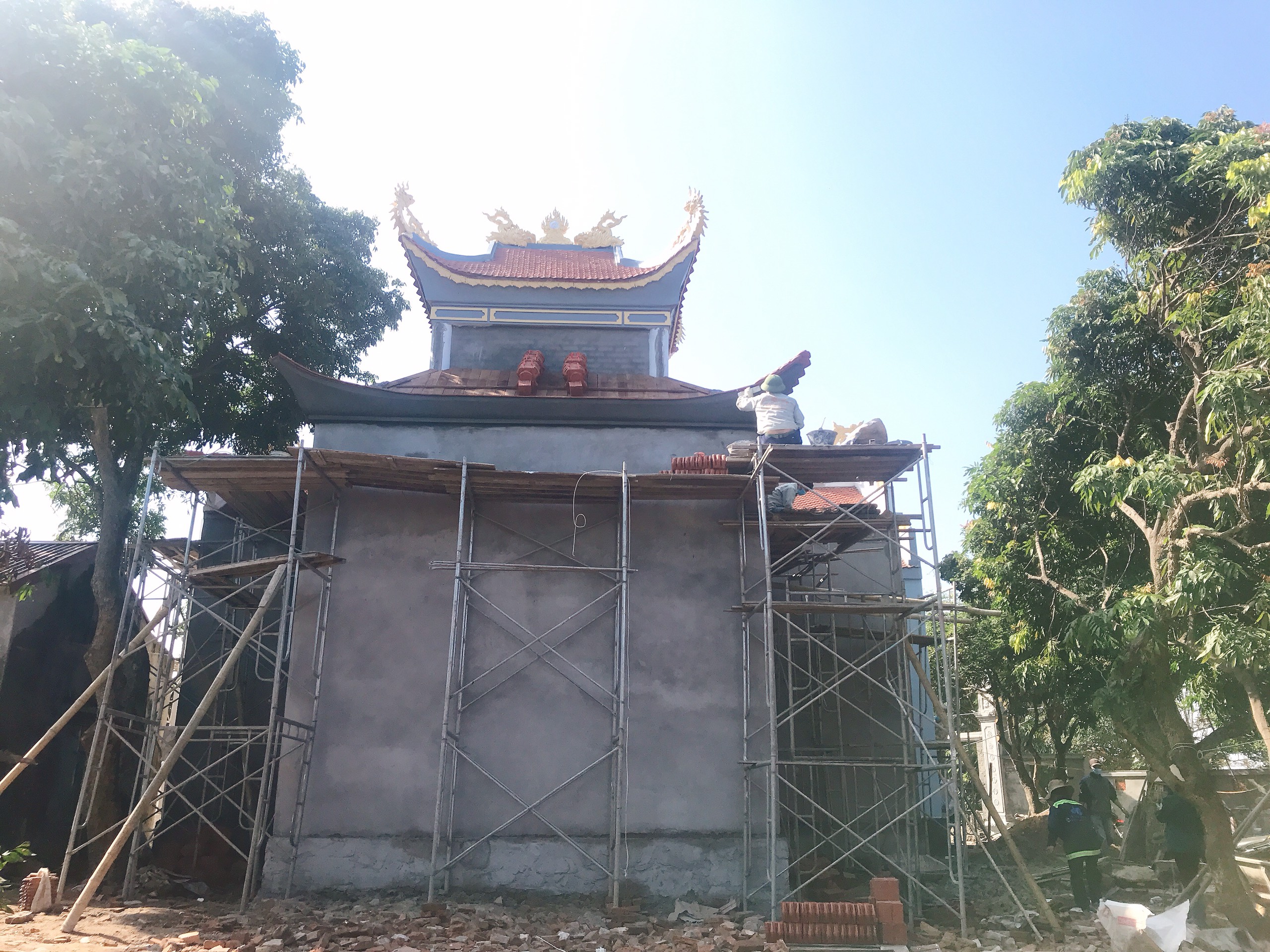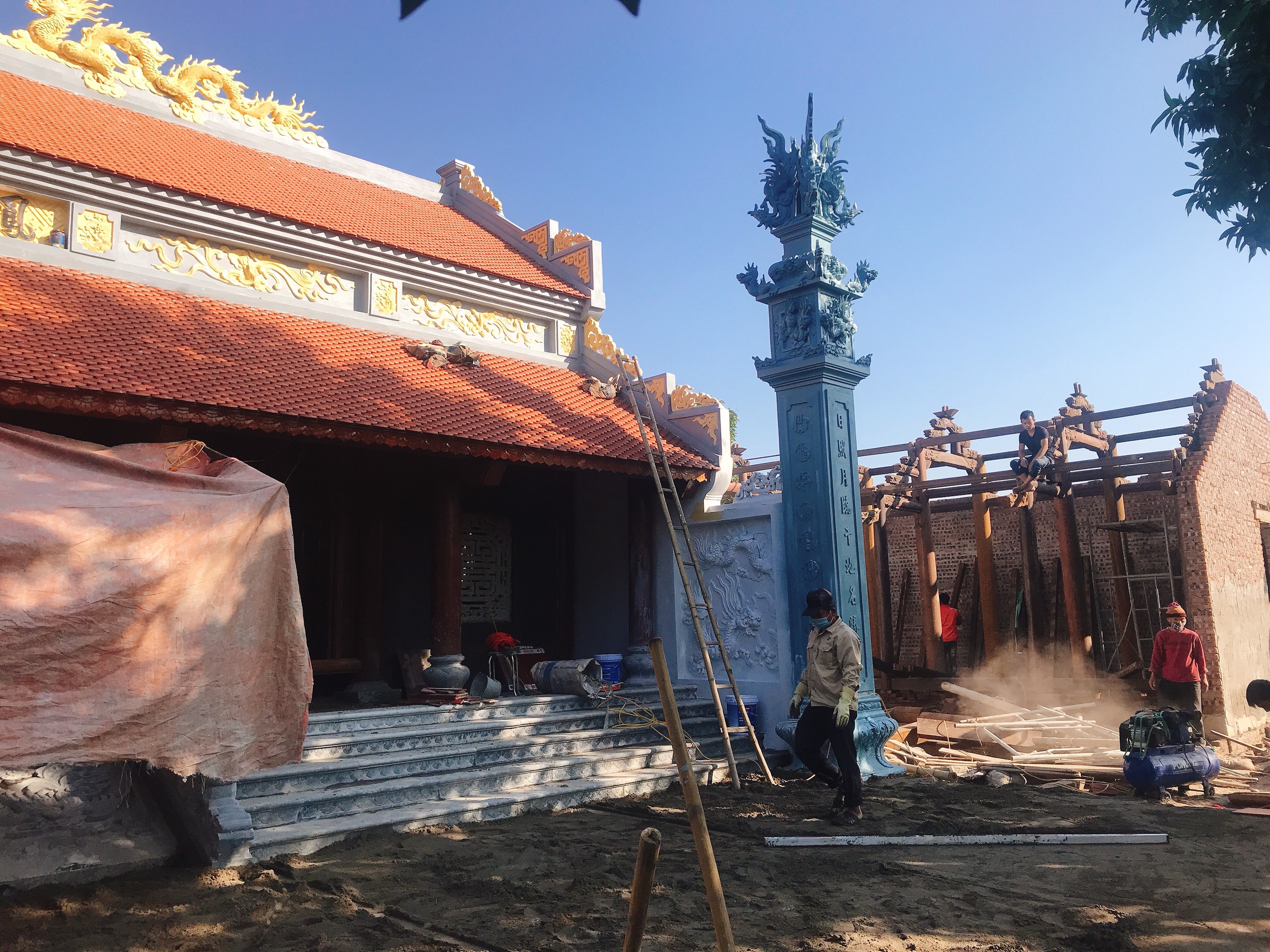 Xây dựng nhà cổ cùng các bác thợ đang thúc đẩy nhanh tiến độ xây dựng đền Bà Cúc Hoa để kịp làm lễ ngày 22/01/2022 (tức ngày 20/12/2021 âm lịch)
