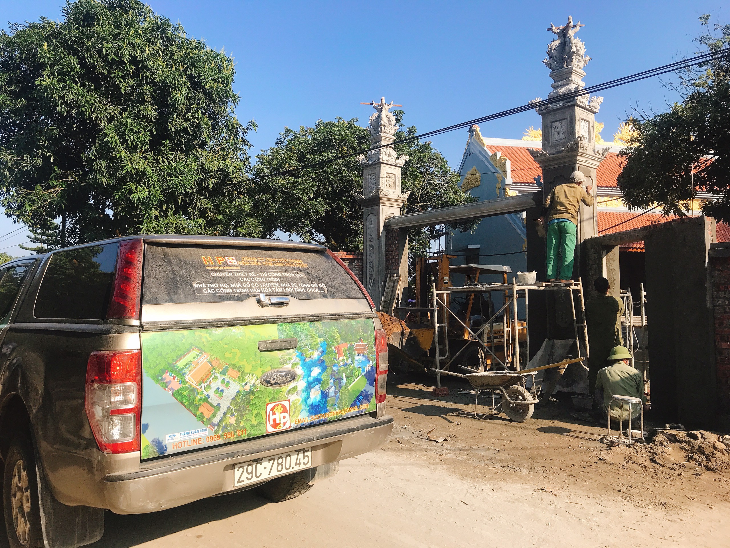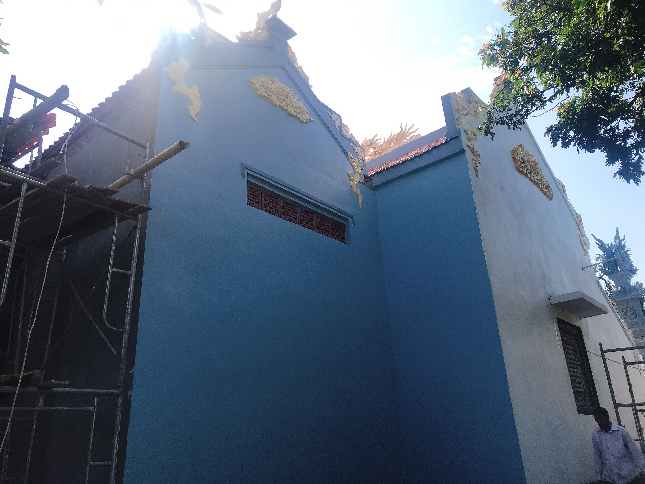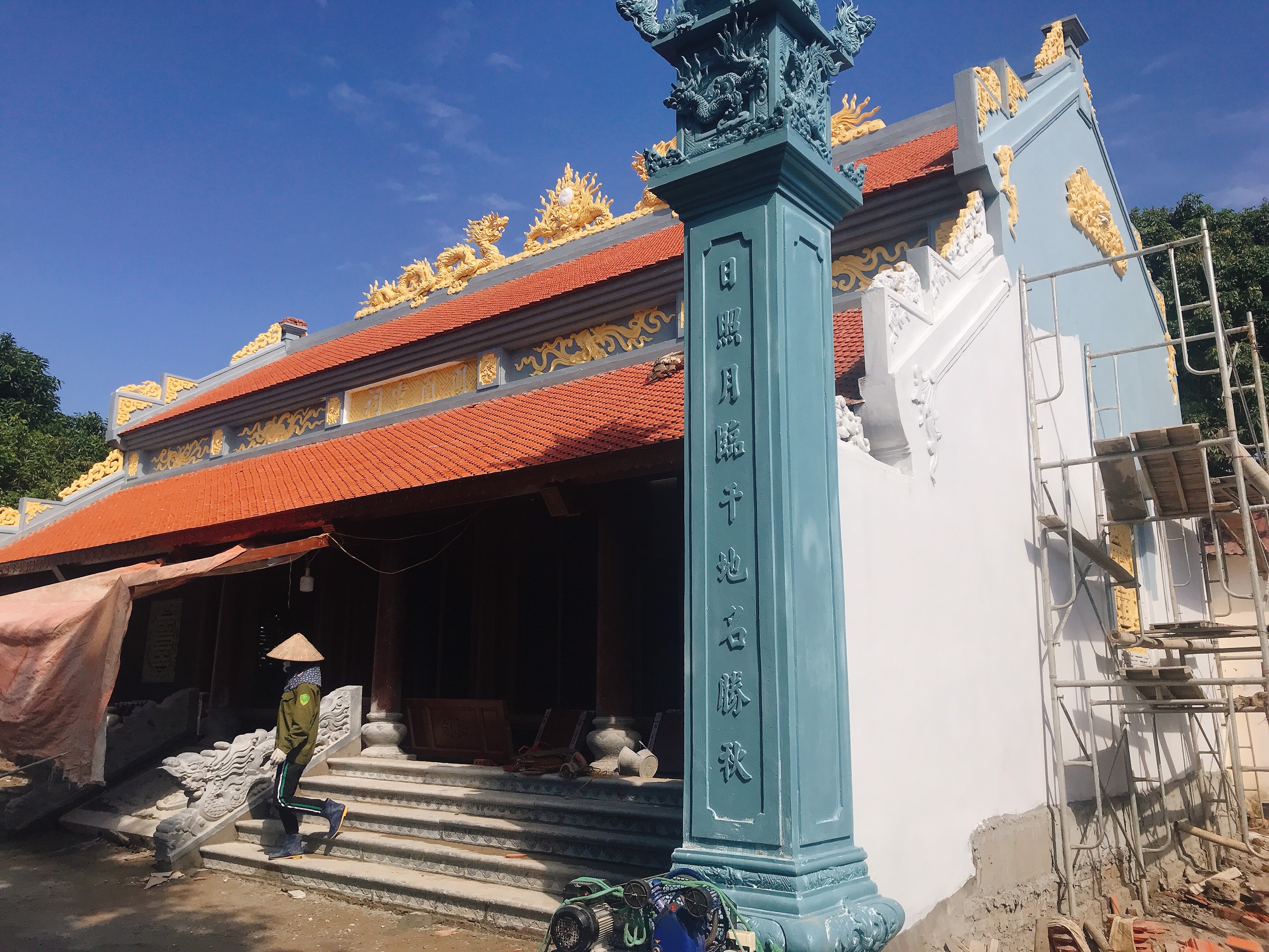 Xây dựng nhà cổ cùng các bác thợ đang thúc đẩy nhanh tiến độ xây dựng đền Bà Cúc Hoa để kịp làm lễ ngày 22/01/2022 (tức ngày 20/12/2021 âm lịch)